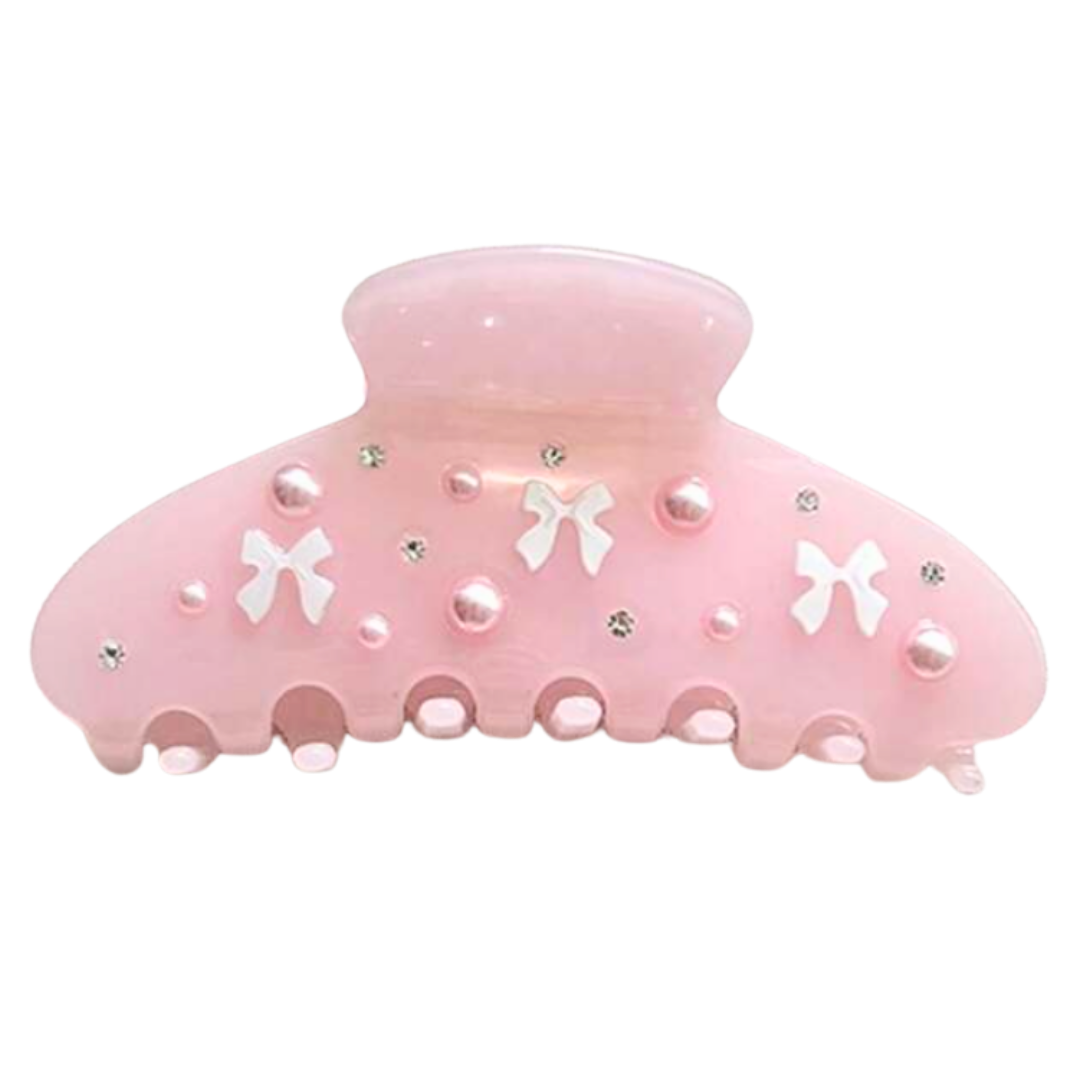 Pink round claw clip with scattered bows, pearls and rhinestones.